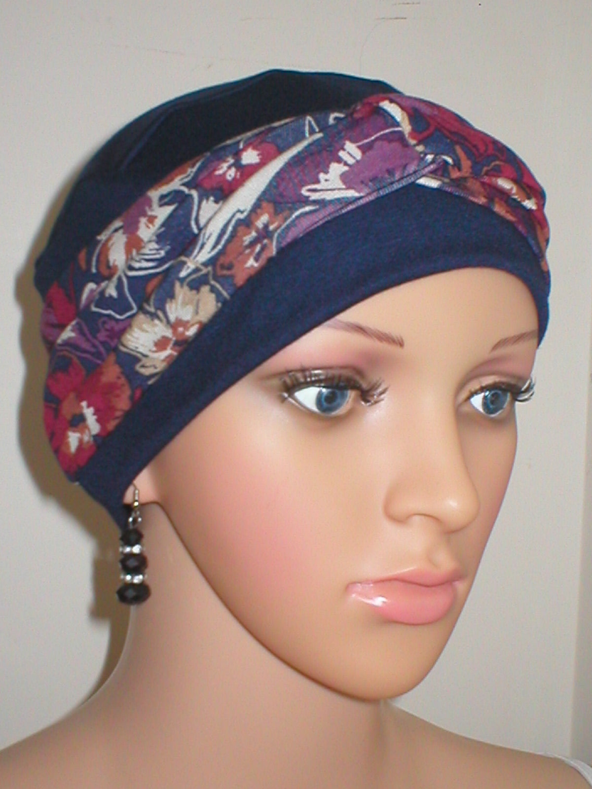 Soft chemo hat for hair loss and removable twist headband - Tina - Navy pansy