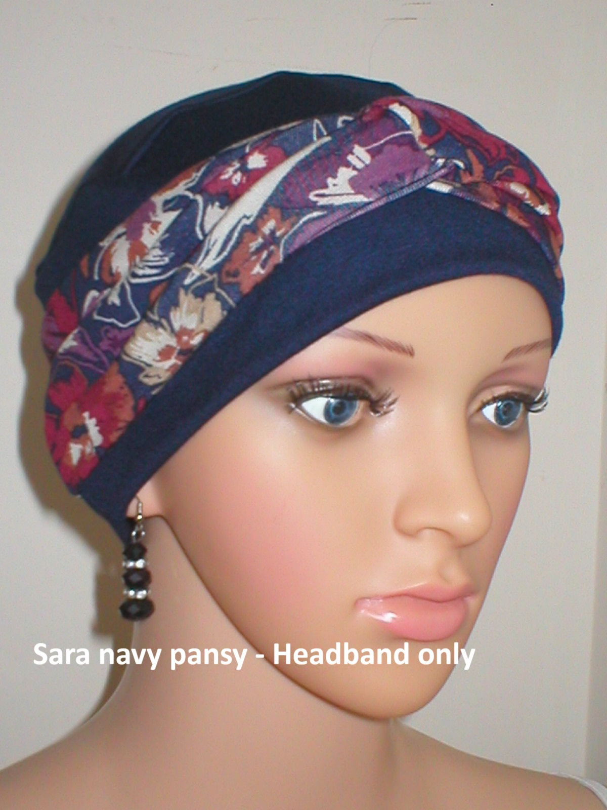 Soft twist jersey patterned stretchy chemo headbands - Sara Navy pansy